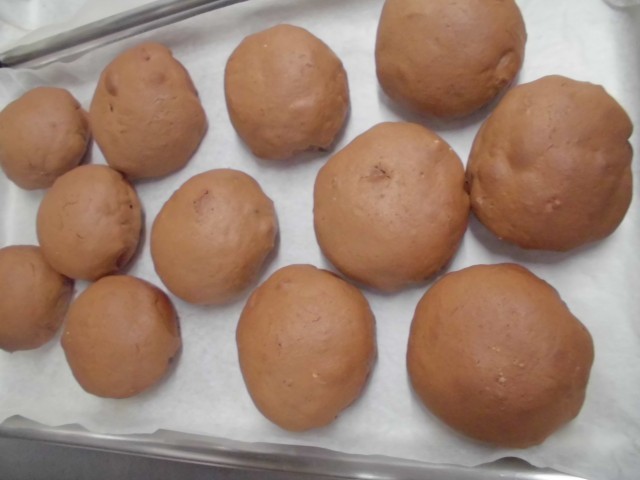 給食室でココアクッキー生地を作り、チョコチップパンにかぶせて焼きました。