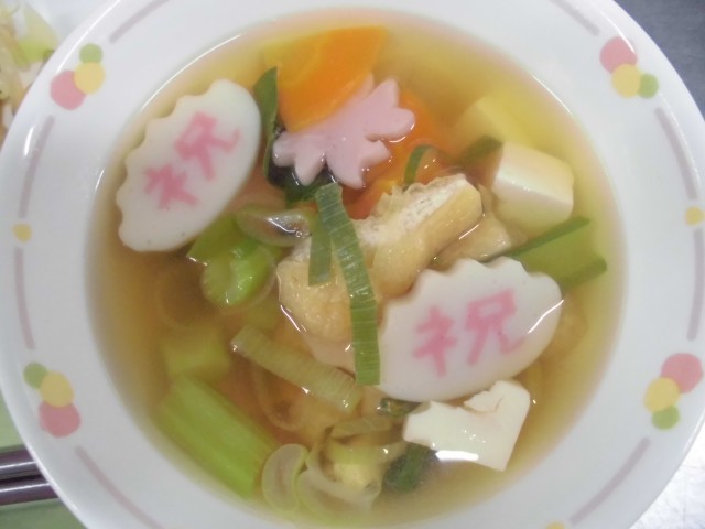 また、「お祝い汁」は、桜の形のかまぼこと、「祝」のかまぼこを入れました。