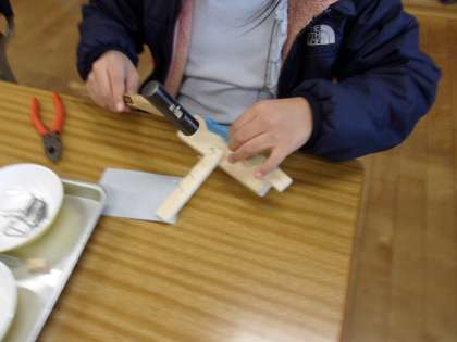 3年生の図工の時間、教室から「トントン」という音がリズムよく聞こえてきます。子供たちが、くぎを打つ練習に取り組んでいます。