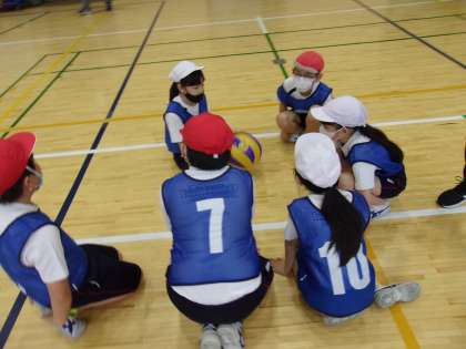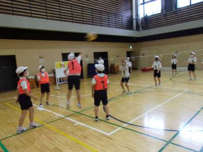 5年生のアリーナでの体育の時間、「つながれ!ソフトバレーボール!!」と題して、学習が展開されています。自陣に落とさないように、敵陣に落とせるように作戦も工夫しながら、楽しく真剣に取り組んでいます。