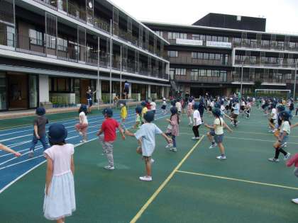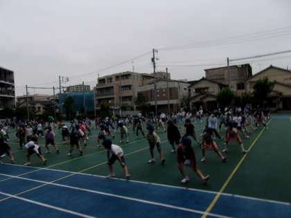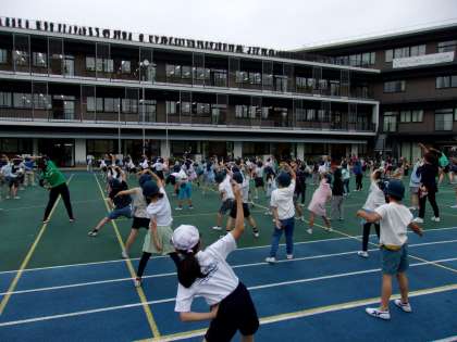 久しぶりに、校庭に出ての体育朝会を行いました。今日は1年生と2年生です。内容は「8.8.4.4.2.2.1.1」のリズムで体操をするというもので、8個間の運動を4→2→1というふうにリズムを早めていくものです。詳細はお子さんに聞いてください(笑)。やはり外に出てみんなで体を動かすのは気持ちがいいものです。