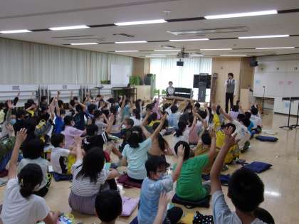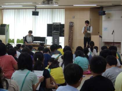 4年生と5年生を対象に、箏と尺八の演奏会を開催しました。講師は、石垣征山さんと石垣 清美さんです。子供たちは気づいたいこと、知ったことをメモしながら、邦楽演奏の良さを味わうことができていました。