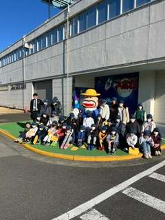 見学先の一つは「明治なるほどファクトリー坂戸工場」です。カールおじさんの前でまずは記念撮影。