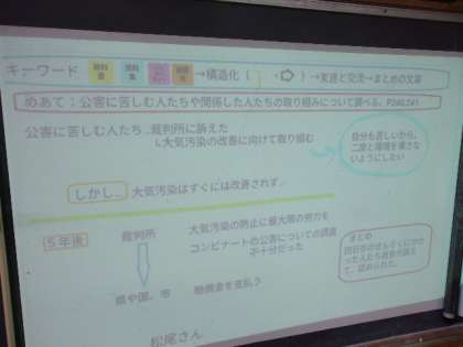 5年生の社会科では公害問題などの環境に関する課題を自分で調べながらタブレットにまとめていく学習を進めています。