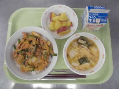 豚キムチ丼 リンゴとサツマイモの重ね煮 丸ごとわかめの味噌汁 牛乳