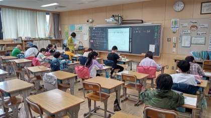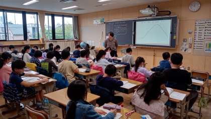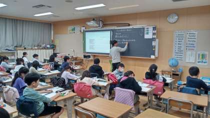 黒板に映された指導者用デジタル教科書を見ながら学習しています。