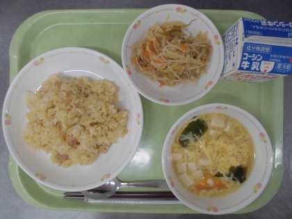 チャーハン わかめ卵スープ ビーフンソテー 牛乳