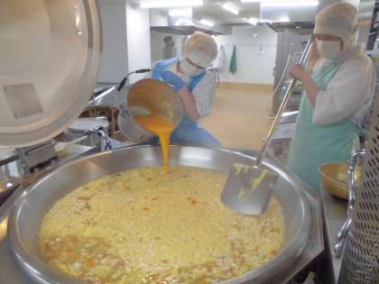 だいたい300個くらいの卵を給食室で調理員さんが1つ1つ割りました。