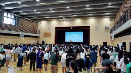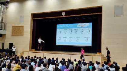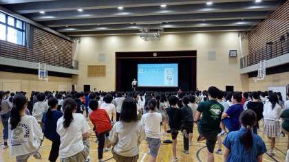 今日の体育朝会は、4年生から6年生です。昨日の1年生から3年生と同じようにストレッチを行い、体の柔軟性を高めました。
