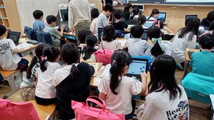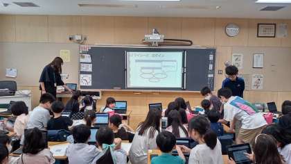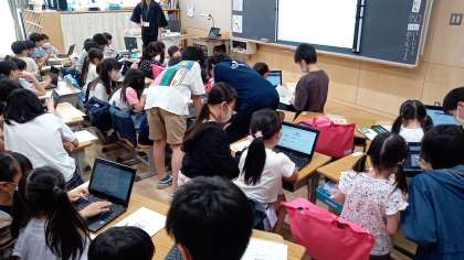 体力テストの実施に向けて、6年生が1年生の教室でタブレットに担当する子供たちの学年学級や名前などのデータ入力をしてあげています。