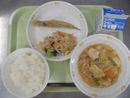今日の給食の牛乳、ししゃも、豆腐、小松菜はカルシウムが多く含まれています。