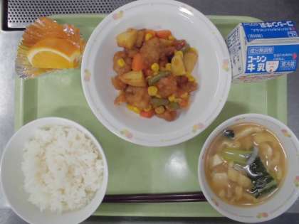 ごはん 鶏肉とコーンの揚げ煮 えのきの味噌汁 甘夏 牛乳