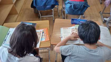 5年生の英語でアルファベットの書き方の練習をしていました。「A、B、C・・・」と一文字ずつアルファベットの発音を聞きながら、罫線に合わせて書いていました。