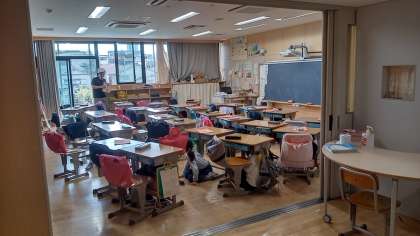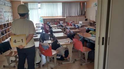 本日小中学校合同による雛訓練でした。大きい地震が起きた想定で訓練を行います。緊急地震速報が流れて、子供たちは机の下にすぐに隠れました。