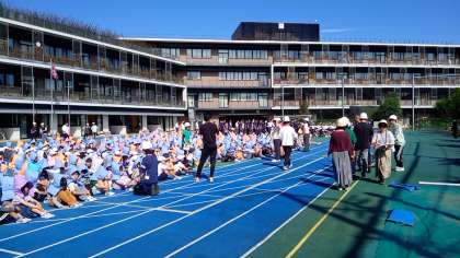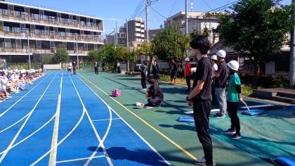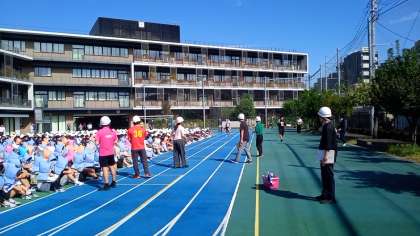 中学校の副校長先生の話では、地震で避難する場合と火事で避難する場合の避難行動の違いについての話がありました。また、児童・生徒の代表の言葉で、小学校は放送委員会委員長が話をしました。