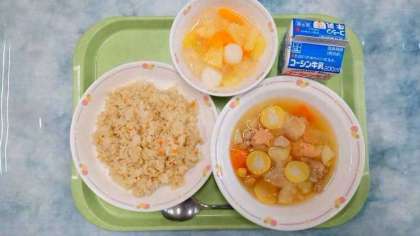 きのこピラフ お月見スープ フルーツ白玉ポンチ 牛乳
