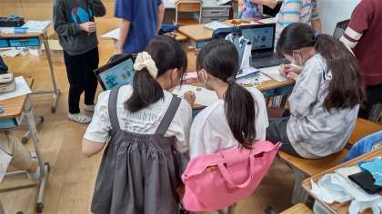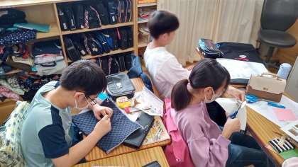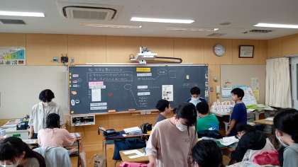 6年生、自分で作成する袋のアップリケ付けを行っています。タブレットを使用して見本を調べている子もいました。