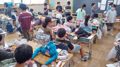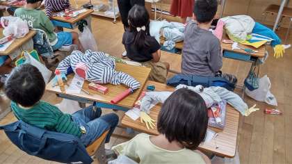 3年生の図工で不要なシャツを使って、ぬいぐるみを作っています。自分が好きなものを装飾していて、とても楽しそうに作成しています。