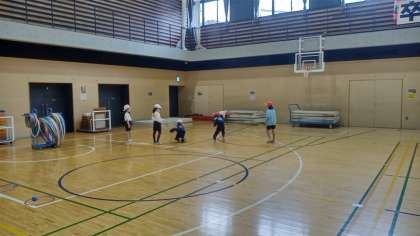 1年生が体育館でマットやボールなどを使って、楽しくゲーム感覚で体をたくさん動かしています。とても楽しそうです。