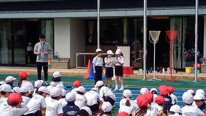 本日の3・4時間目に低学年のスポーツ大会が実施されました。「わくわく10」として、中学年・高学年と実施されましたが、最後に低学年が行います。2年生の司会で始まりました。