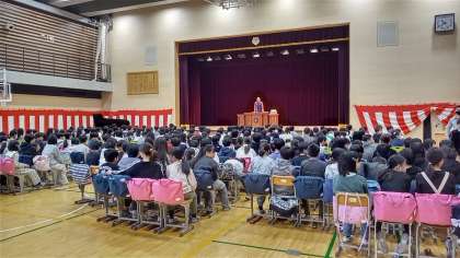 本日の3・4時間目、卒業式リハーサル前の最後の5・6年生の合同卒業式練習を行いました。5年生のリコーダーの伴奏で6年生が入場していきます。