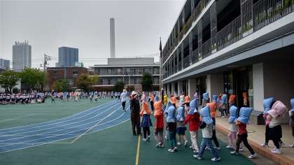 本日、小中合同の今年度初めての避難訓練がありました。大地震があった想定で、机の下に隠れたり、校庭にいる児童はダンゴ虫のポーズをとったりして、安全を確保しました。その後、校庭に避難を開始しました。
