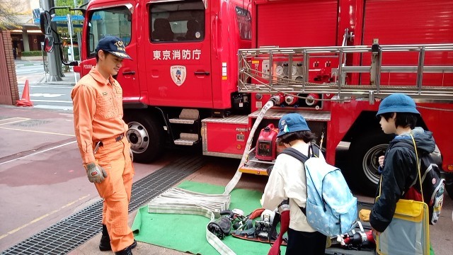ポンプ車と搭載されている道具などの説明を受けています。