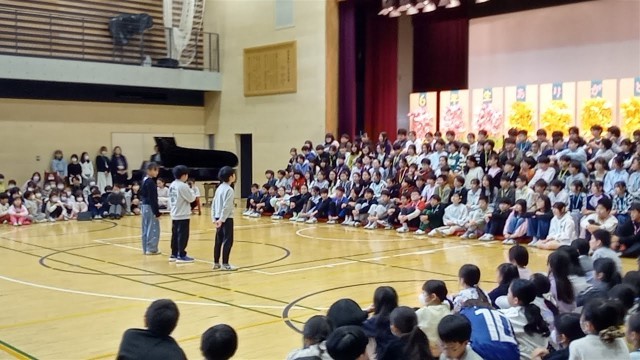 本日の児童集会は、先生の特技を当てるクイズ集会でした。代表の先生に台上に上がって...