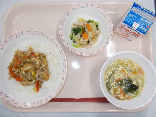 ~旬の食材を食べよう~ さんまの蒲焼き丼(米粉) 塩昆布和え 根菜のみそ汁 牛乳