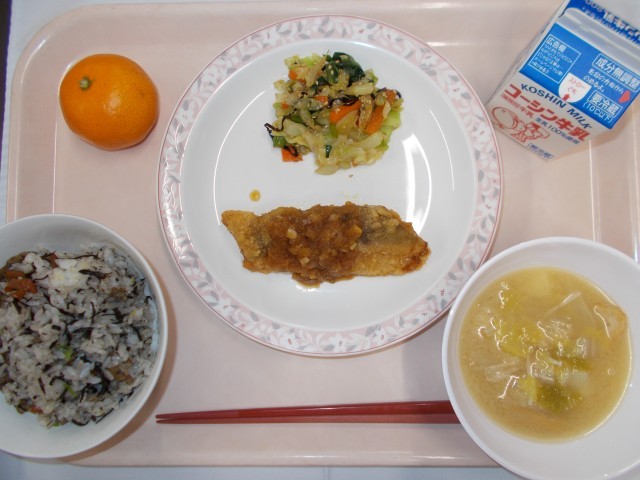 ~旬の食材を食べよう~ 茶飯 おでん からし和え 果物(夢オレンジ) 牛乳