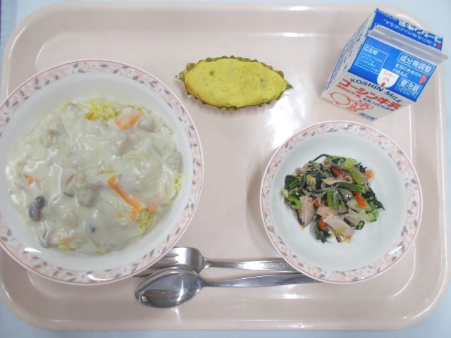 10月2日(火)の給食 公開日 2025/10/02 更新日 2025/10/02 給食・食育 ~骨々(コツコツ)給食~ カレーピラフ キノコソースかけ 小松菜サラダ 豆乳入りスイートポテト 牛乳 いいね(0)