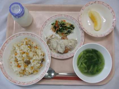 献立 コーンピラフ スープ チキンクリーム煮 温コールスロー りんご 牛乳