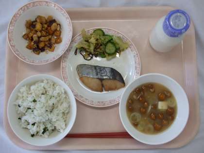 献立 わかめご飯 なめこ汁 鰆の照り焼き 塩昆布和え さつまいもと大豆の甘辛揚げ 牛乳