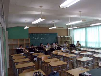 午前中、バドミントン部、サッカー部、吹奏楽部が暑さに負けず練習しています。