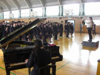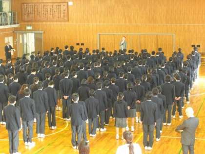 始業式の校長先生のお話、校歌斉唱の様子です。