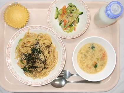 献立 ・和風スパゲティー ・チーズのふわふわスープ ・ツナサラダ ・マーラーカオ ・牛乳
