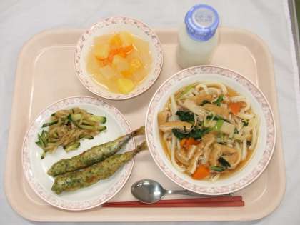 献立 ・五目うどん ・ししゃもの磯辺揚げ ・和風サラダ ・タピオカフルーツポンチ ・牛乳
