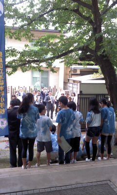 国際セーフコミュニティ認証センター・日本セーフコミュニティー推進機構の方々が池袋本町小学校の取り組みを視察しました。児童全員が自分で作った藍染のシャツを着て出迎えました。