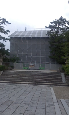 15:12 法隆寺見学。中門は工事中。雨がやみ,晴れ間が見えます。