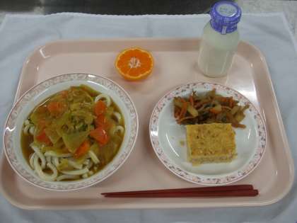 献立 ・カレーうどん ・切り干し大根の卵焼き ・じゃが芋のきんぴら ・みかん ・牛乳