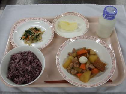 献立 ・黒米ご飯 ・いりどり煮 ・ほうれん草のゴマ和え ・りんご ・牛乳