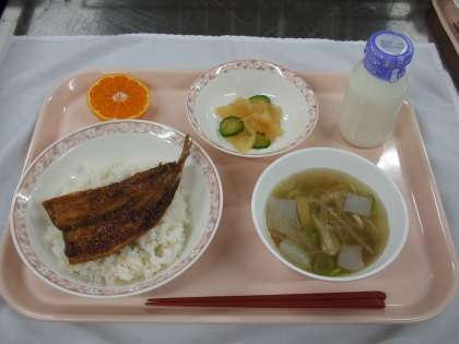 献立 ・いわしの蒲焼き丼 ・のっぺい汁 ・大根の浅漬け ・みかん ・牛乳