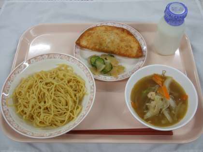 献立 ・タンメンのつけ麺風 ・ジャンボ餃子 ・ピリ辛漬け ・牛乳