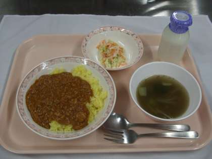 献立 ・ターメリックライスのキーマカレー ・スープ ・コールスローサラダ ・牛乳