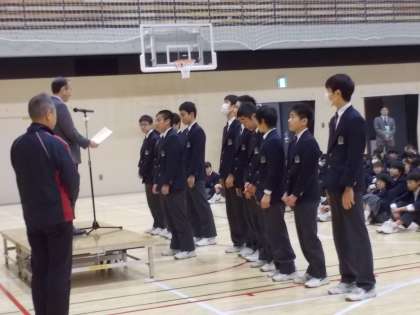 生徒朝礼の様子です。生徒会長、各委員会の委員長の話に続き、漢字検定・ポスターコンクール・読書感想文・英語検定・柔道・PTA親子ソフトボール等たくさんの表彰がありました。