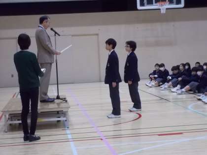 3学期になって最初の全校朝礼がありました。校長先生からはISSあいさつ運動の話と踏切の歩道橋工事等の話がありました。また、バレーボール部、バドミントン部、柔道の表彰がありました。