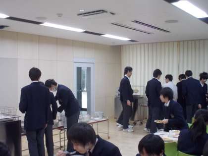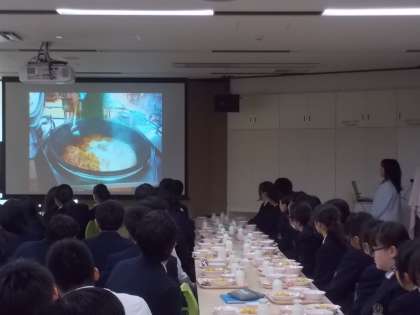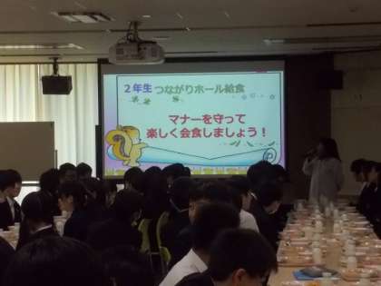 先週の1年生に引き続き、本日2年生が学年全体での給食をつながりホールでいただきました。配膳後に栄養士の黒沢先生が作成した「給食ができるまでの様子」の映像を見ました。また、何人かの生徒がおかわりをしていました。