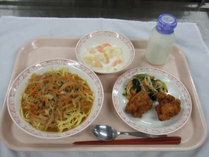献立 ・担々麺 ・から揚げ ・海藻サラダ ・フルーツヨーグルト ・牛乳