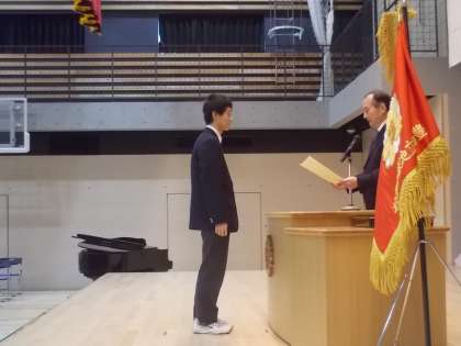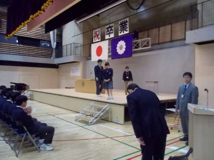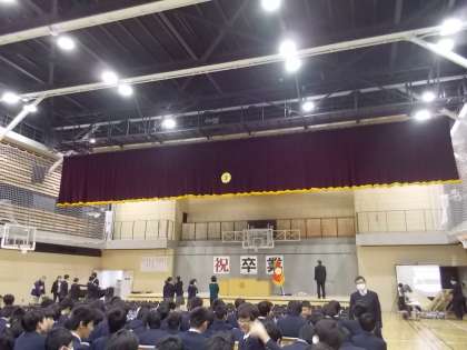 3・4校時に卒業式の予行を行いました。練習の途中でPTAからの卒業記念を代表の生徒が受け取りました。また、産業奨励賞および体育優良生徒の表彰もありました。