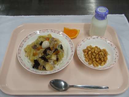 献立 ・中華丼 ・大豆とじゃこの甘辛揚げ ・清美オレンジ ・牛乳